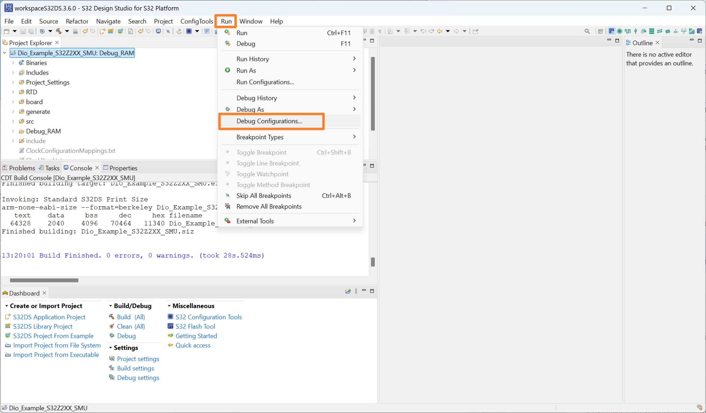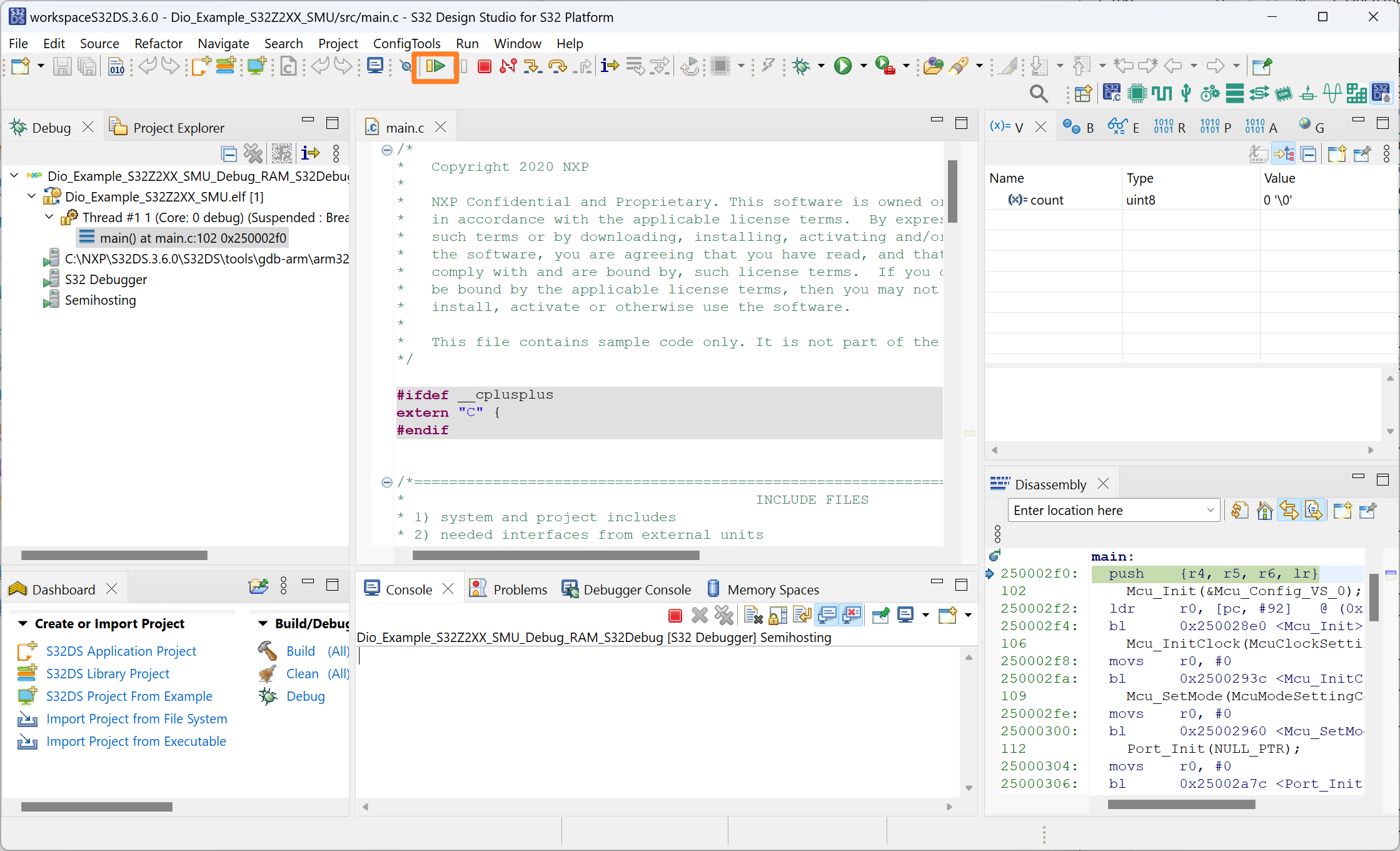 16. Dio_Example_S32Z2XX_SMUプロジェクトを選択し、[Debug(デバッグ)]をクリックします
