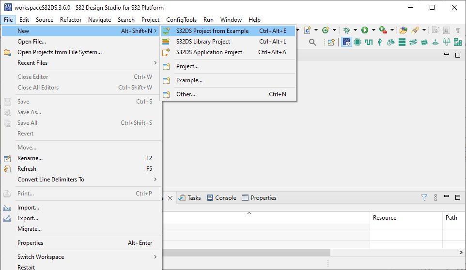 2. [File(ファイル)]>[New(新規)]>[S32DS Project from Example(サンプルに基づいたS32DSプロジェクト)]の順に進みます