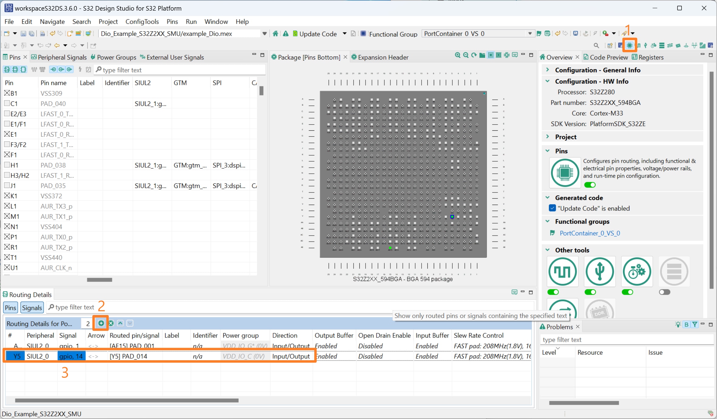 8. [Pins configuration(ピンの構成)]アイコンをクリックします。ルーティング項目の新しい行を追加し、図に示すようにSIUL2_0ペリフェラルにGPIO 14を構成します。この構成により、GPIO 14でEVBのD12 LEDを制御できるようになります