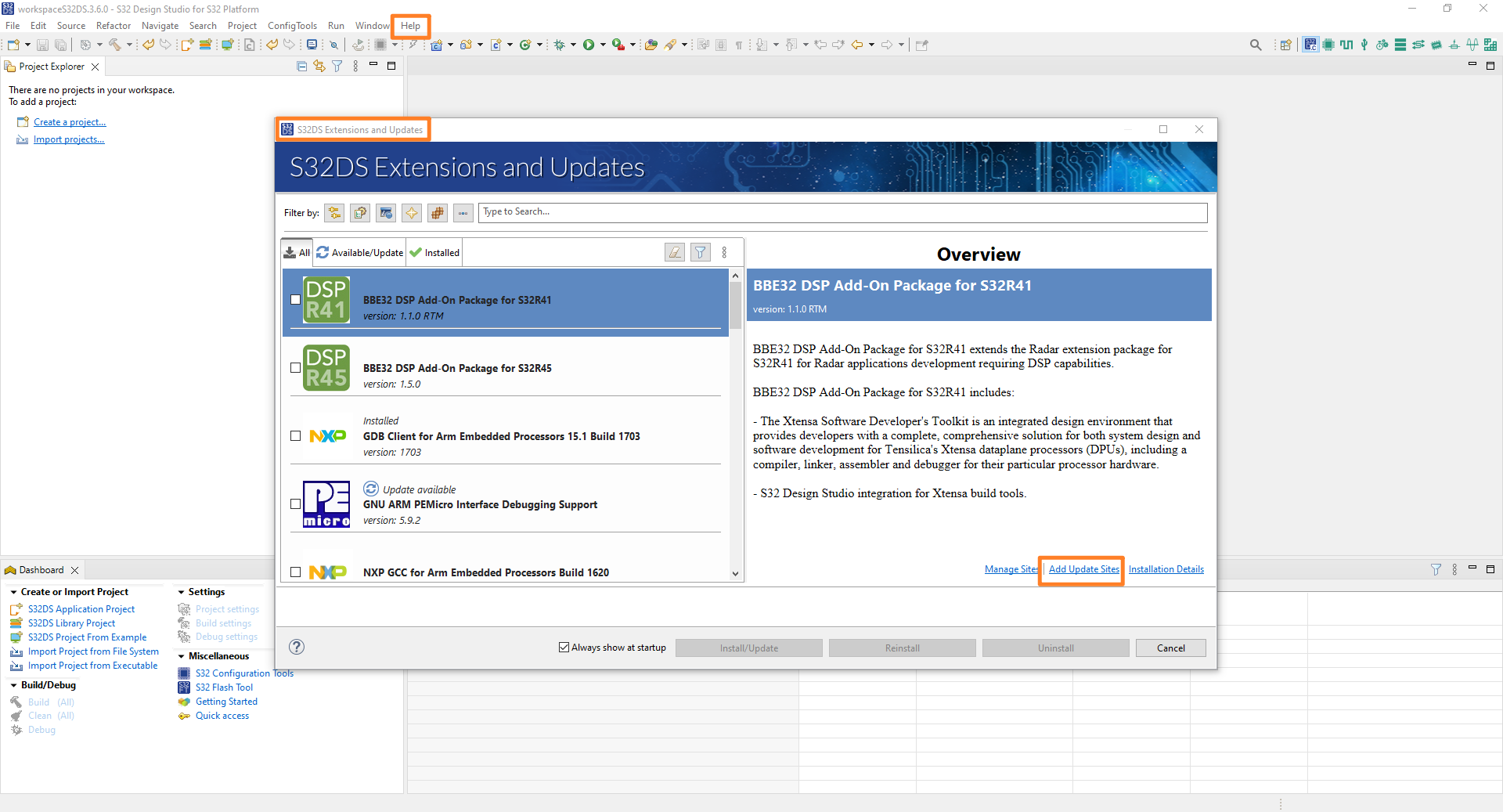 S32ZE Real Time Drivers Version 2.x.x updatesite.zipをダウンロードします。S32 Design Studioを開きます。[Help(ヘルプ)]>[S32DS Extensions and Updates(S32DSの拡張と更新)]>[Add Update Sites(更新サイトの追加)]の順に進み、ダウンロードしたupdatesite.zipを選択します。