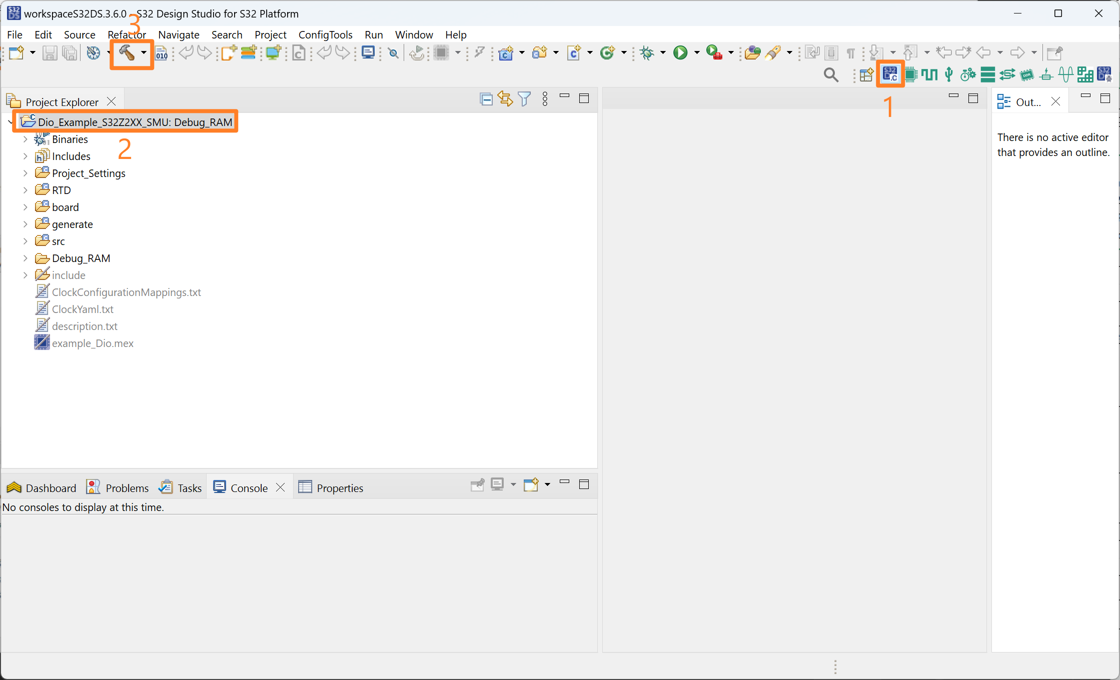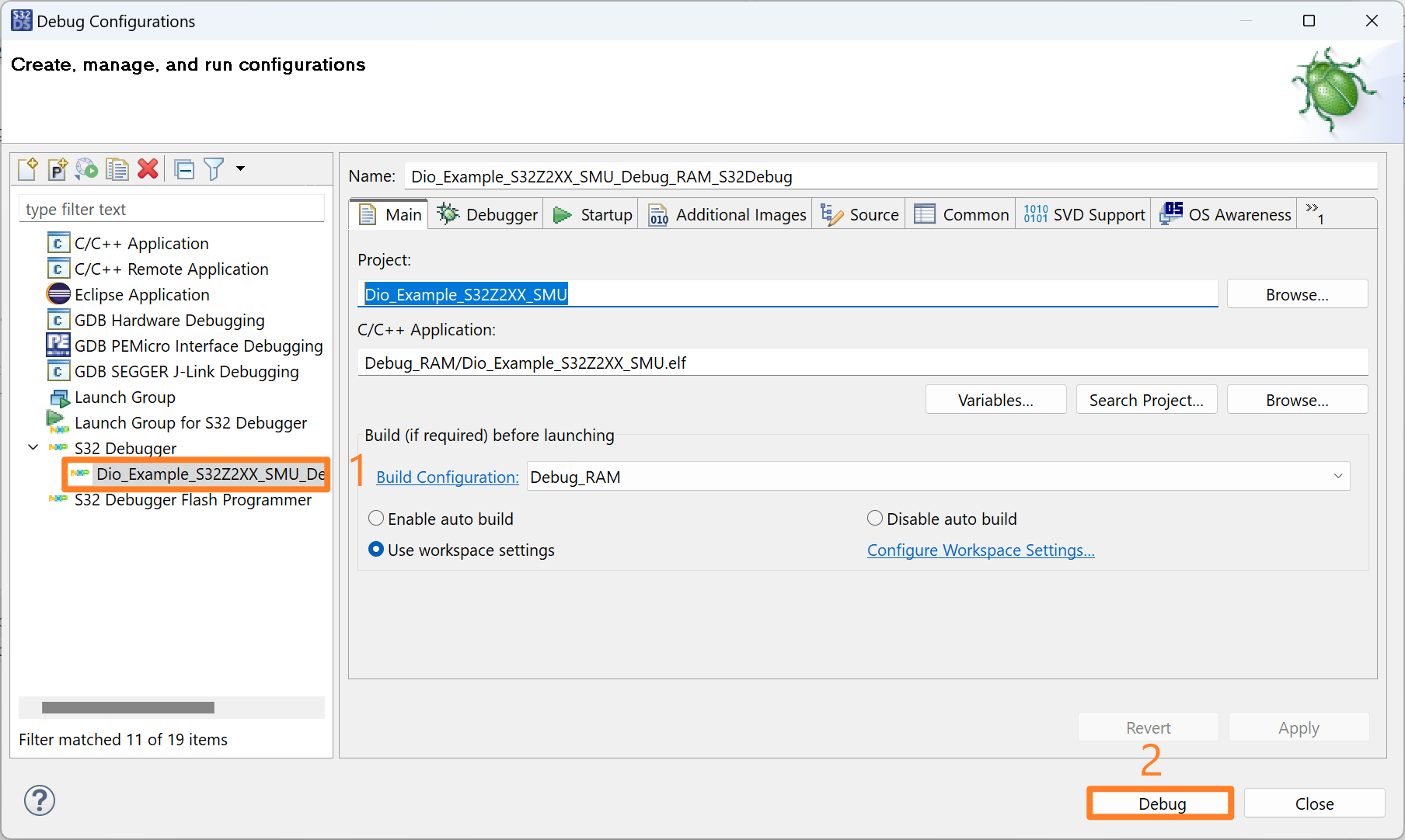 Dio_Example_S32Z2XX_SMUプロジェクトを選択し、[Debug(デバッグ)]をクリックします