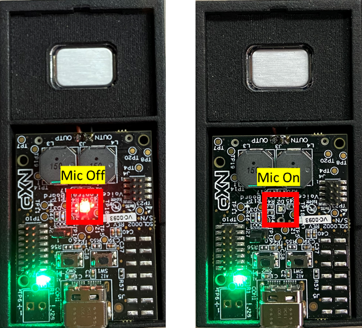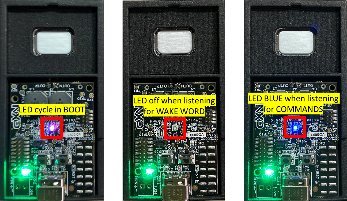 The final step before the device starts listening will turn the LED red for about 2 seconds before turning off. Once the LED is off, the demo is running and listening for the wake word.
