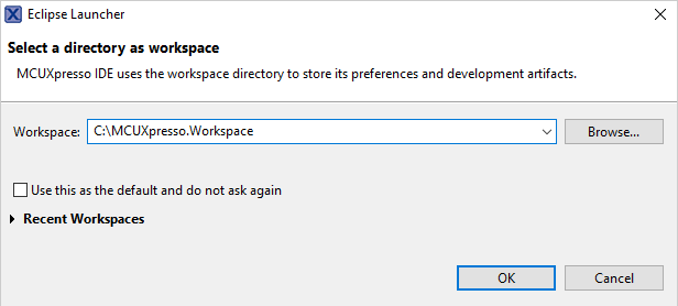 Launch MCUXpresso IDE, define the Workspace location, and press the OK button, as shown in Figure 15.