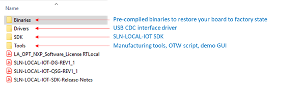 In addition to the contents listed above, owners of the SLN-LOCAL-IOT development kit can also access a software package containing the SLN-LOCAL-IOT MCUXpresso SDK, precompiled release binaries, and manufacturing tools.