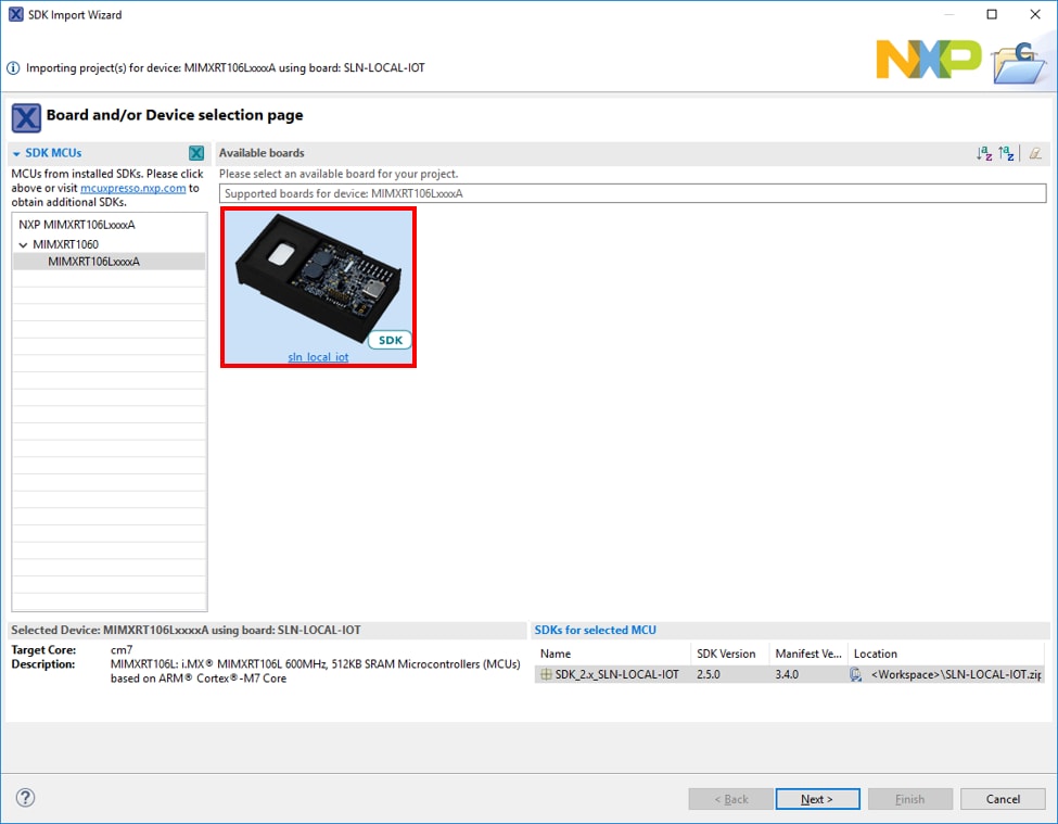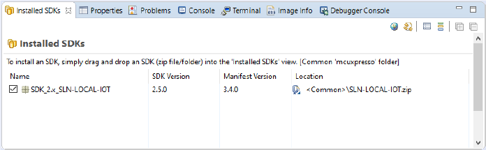 To install the SLN-LOCAL-IOT SDK into MCUXpresso IDE, simply drag-and-drop the SLN-LOCAL-IOT.zip file into the Installed SDKs tab at the bottom of the MCUXpresso IDE. Figure 17 shows a screenshot after installing the SDK.