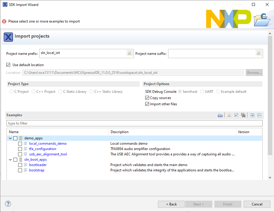 In this section we show how to import / build / run example projects in MCUXpresso IDE, where the projects are already available in SLN-LOCAL-IOT SDK. Users will experience how to customize the demo application by simply letting the LED blink when a command is detected.