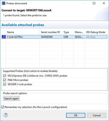 Users should see a pop-up window like Figure 25. Select the J-Link probe that is connected to the kit and press OK.