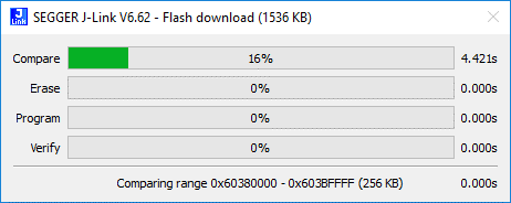 This will launch the flashing tool and proceed to load the image into the flash. The programming status is displayed on another pop-up window like Figure 26. When this is complete, the debugger will be launched and running. Users can then step, run or set breakpoints.
