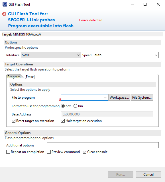 In the Base Address field, change the address to 0x60000000 to select the base address of the flash. Clicking on Run… will kick