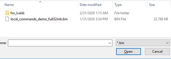 Select the Filesystem button to open a file selection window and select the local_commands_demo_full32mb.bin file from the
