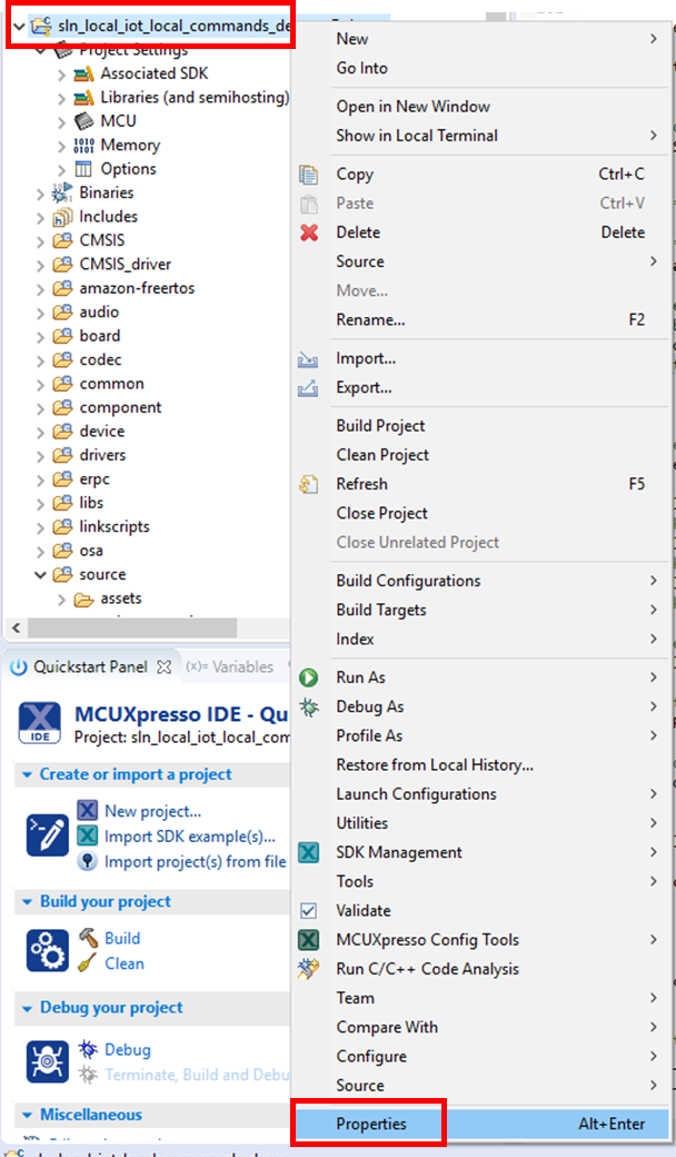 Before building the application, users need to make sure that the MCUXpresso project generates a .bin file as an outcome of the build process. Right click on the project name and open Properties, as shown in Figure 33.