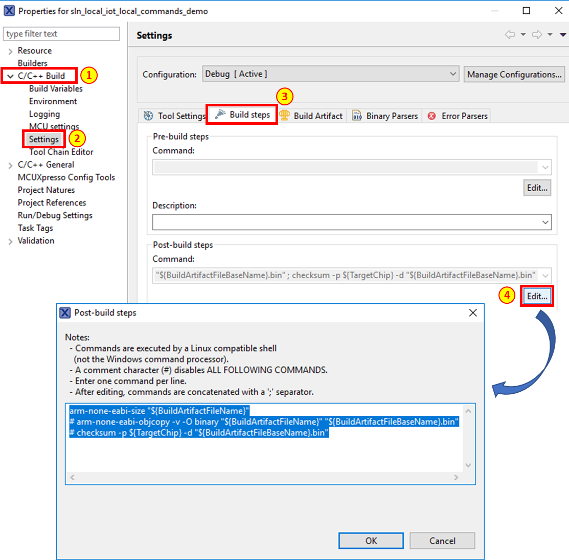Expand C/C++ Build in the menu and click Settings. Select Build steps tab where Post-build steps can be edited. Click Edit and it will show the commands for the Post-build steps. Figure 34 illustrates how to open the Post-build steps window.