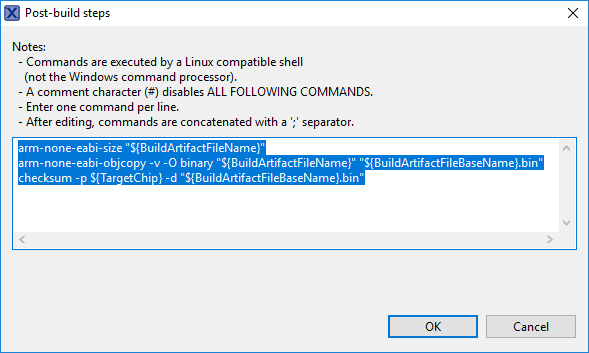 A command character “#” disables all following commands. In order to generate .bin file in post-build process, remove the character “#” and click OK. The resulting commands must look like Figure 35 after removing “#”: