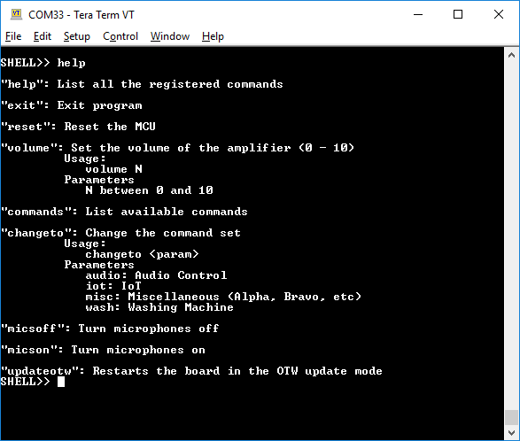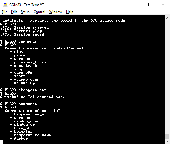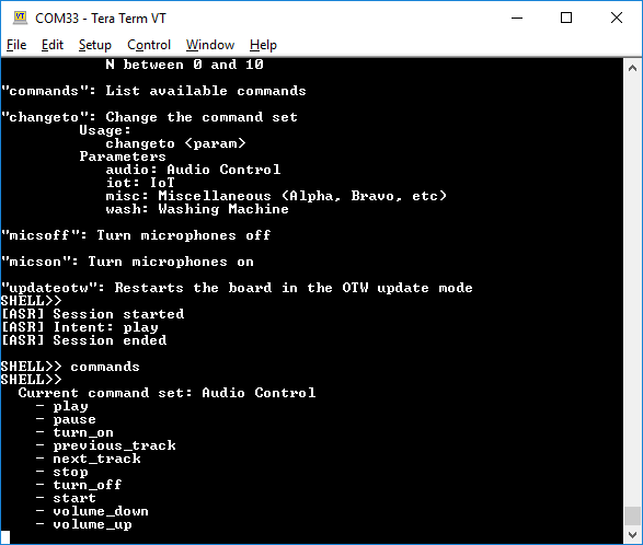 The kit ships with four command sets for control of audio playback (audio), smart home (iot), washing machine (wash), and some generic commands (misc). Only one command set can be active at a time. Audio is the default command set. The active command set can be changed via the serial terminal interface (see section 1.5). The generic commands are intended to be used for proof of concept and prototype developments that need commands that are not available in the other three command sets.