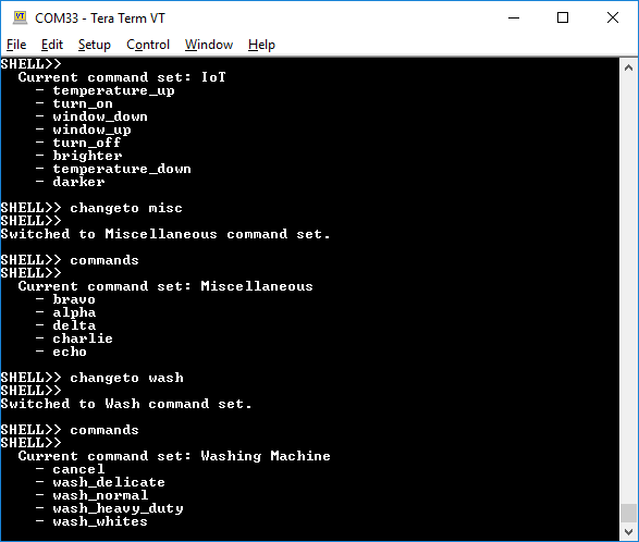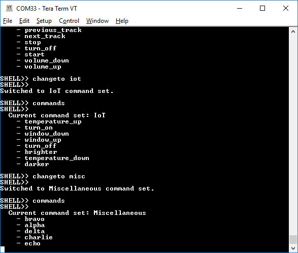 If you would like to change to a different command set, use the changeto command. For example, switching to the IoT command set would use changeto iot as shown in Figure 8. You can find the other two command sets in Figure 9 and Figure 10.