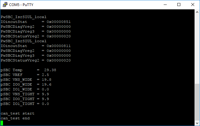 Miriac-EK5744の出力ステータス・メッセージを確認します。すぐに使えるファームウェアは、IP接続のチェック、CANポートのテスト、SBCの温度報告など、さまざまなテストを行います。ファームウェアのテストは無限に繰り返されます。