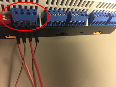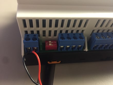 Miriac-EK5744のプロセッサとSBCは、下図に示すポートを介して給電されます。マイナス・ドライバーを使用して、2本のリード線を端子に固定します。グランドは左側、12~24 V入力電源は右側になります。完全に機能させるのに最適な供給電圧は20 Vです。電源アダプタまたはDC電源を使用できます。