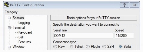 COMポートをPuTTYやTera TermなどのUARTターミナルに接続します。ボーレートは115200を使用します。インストール手順に関するチュートリアルについては、Tera TermチュートリアルPuTTYチュートリアルを参照してください。