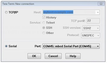 3. Tera Termを起動します。初めて起動する際には、次のダイアログが表示されます。シリアル・オプションを選択します。ボードが接続されている場合は、COMポートが自動的にリスト内に表示されます。