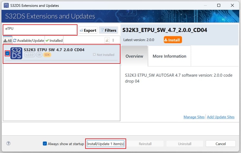 S32DSで、トップ・メニューから[Help(ヘルプ)]→[S32DS Extensions and Updates(S32DSの拡張と更新)]の順に進み、[S32DS Extensions and Updates(S32DSの拡張と更新)]ダイアログを開きます。