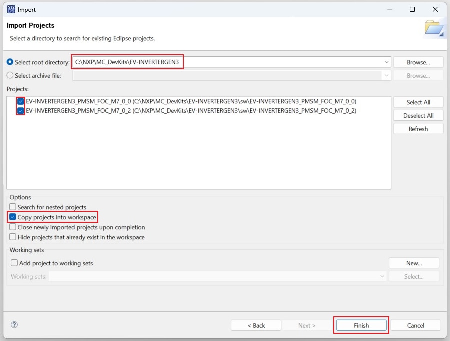 NXP\MC_DevKits\EV-INVERTERGEN3に移動して、[Select Folder(フォルダを選択)]をクリックします。次に、[Copy projects into workspace(プロジェクトをワークスペースにコピー)]オプションのチェックボックスをオンにします。[Finish(終了)]をクリックします