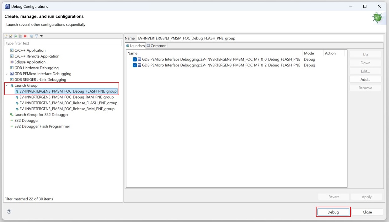 次に[Launch Group(起動グループ)]を展開し、最初の起動設定をクリックします。この設定によって、M7_0_0 プロジェクトとM7_0_2プロジェクトの両方がMCUにアップロードされます。[Debug(デバッグ)]をクリックすると、ソフトウェアがビルドされ、MCUにアップロードされます。