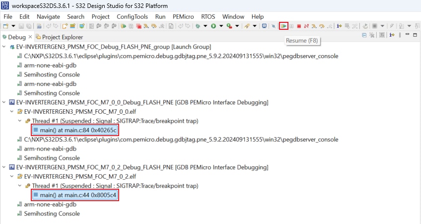 S32DSはデバッグ画面に切り替わります。まず、Ctrlキーを押しながら両方のプロジェクトのmain()ファイルをクリックして、選択状態にします。次に[Resume(再開)]をクリックして(またはF8キーを押して)両方のプロジェクトを実行します。