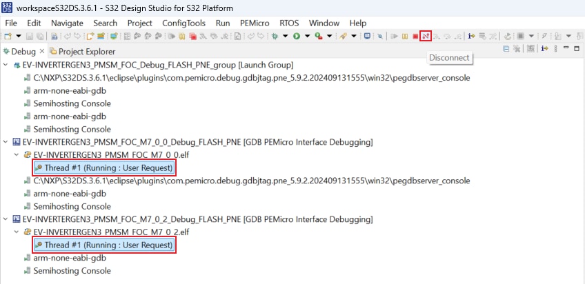 [Disconnect(切断)]をクリックすると、S32DS IDEデバッガとFreeMASTERツールの間の干渉を回避できます。