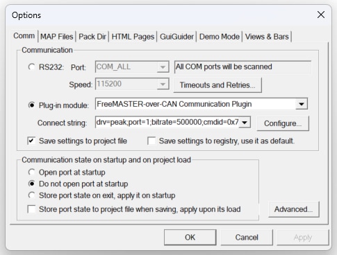 注:[Project(プロジェクト)]→[Options(オプション)]の順にクリックすると、通信設定を確認し、変更することができます。