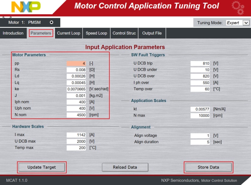 Vepcoモーターを使用しない場合は、使用するPMSMモーターに応じて、モーターのパラメータを編集する必要がある場合があります。モータ制御アプリケーション・チューニング (MCAT) ツールの[Parameters(パラメータ)]タブを開き、左側の値を編集します。