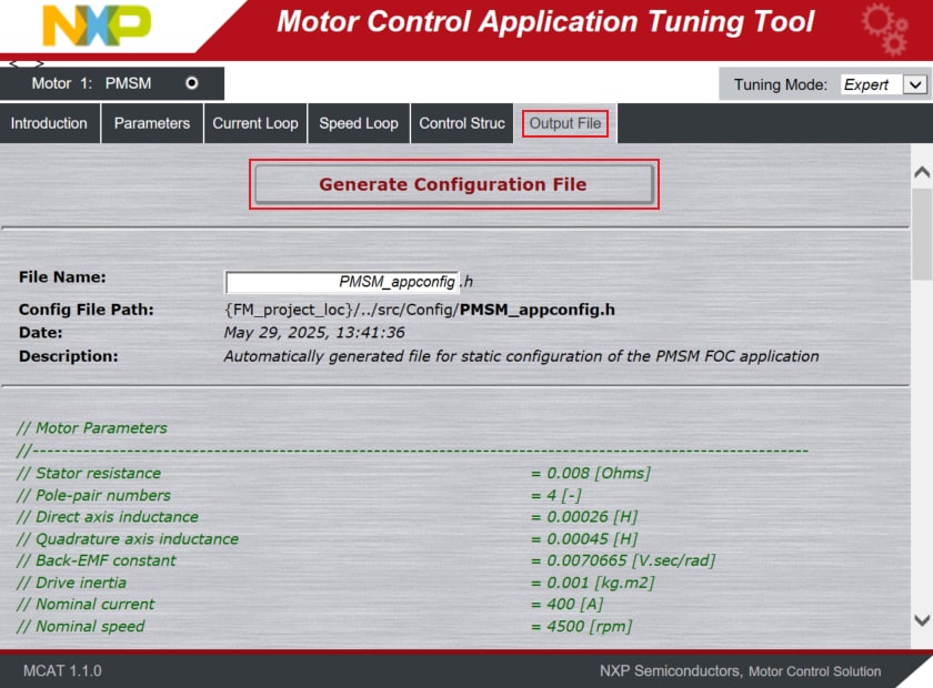 モーターのパラメータの編集が完了したら、[Store Data(データを保存)]をクリックし、[Output File(出力ファイル)]タブに切り替えて、[Generate Configuration File(設定ファイルを生成)]をクリックします。