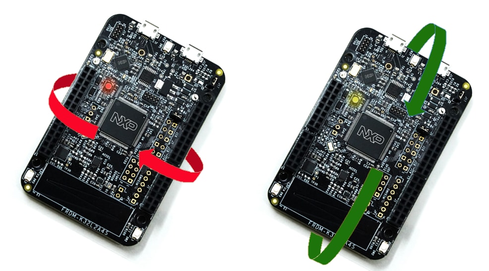 This bubble demo leverages the on board accelerometer. When the board is flat, the red and green LEDs are turned off, and when the board is tilted, the green or red LEDs gradually illuminate based on the degree of tilt on the X- and Y-axis.