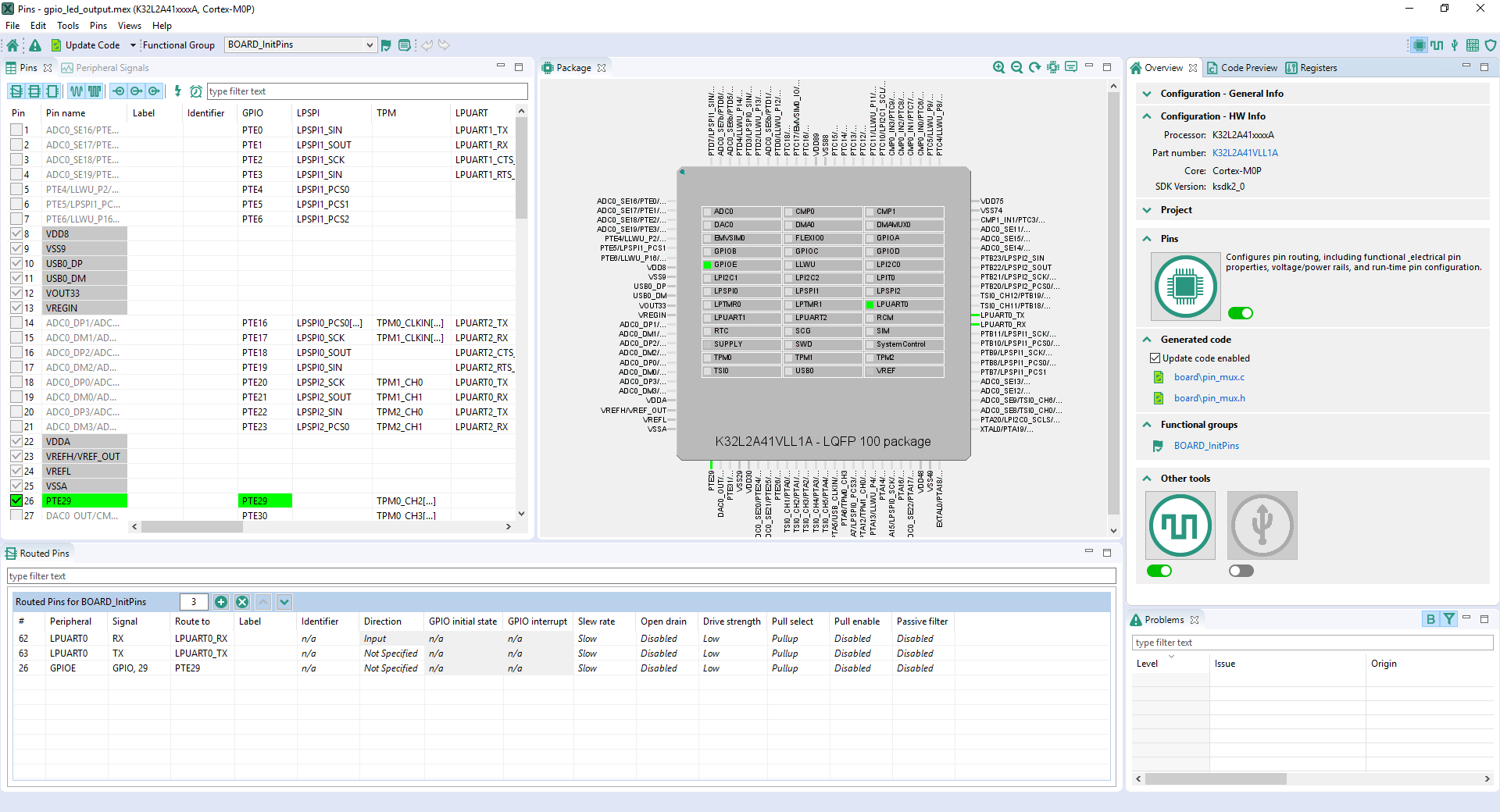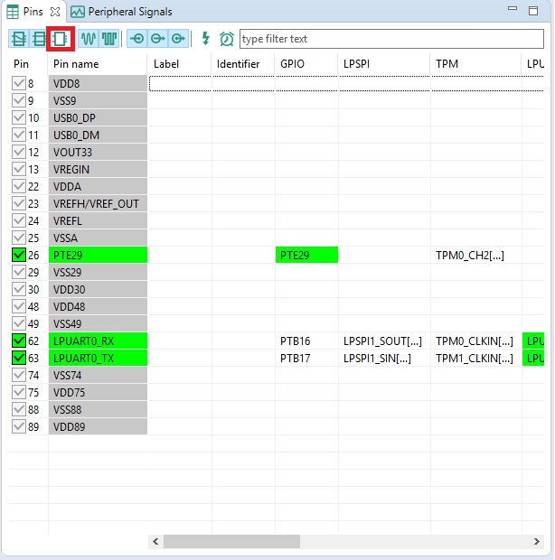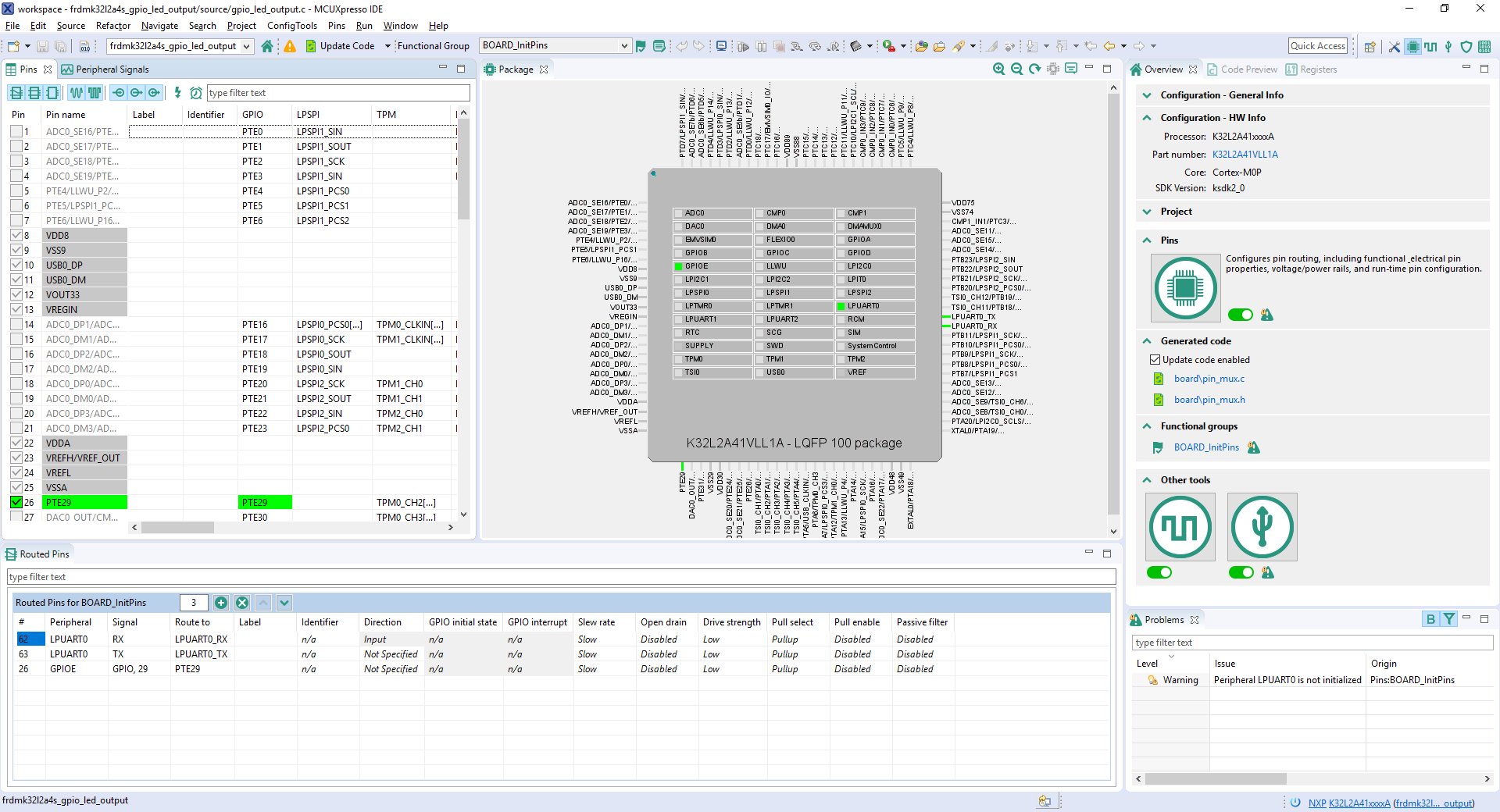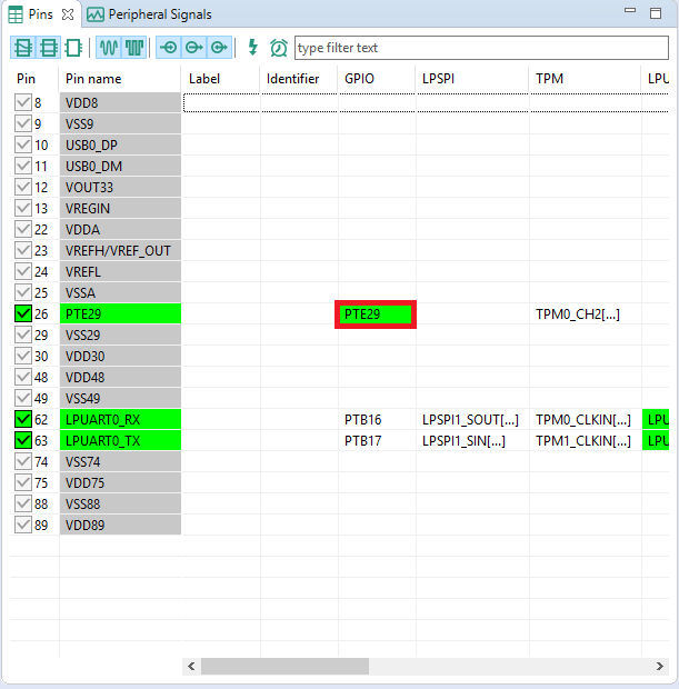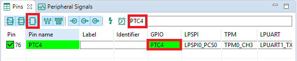 p> Now, let’s use the Pins tool that is part of the MCUXpresso Config Tool to show how to add a new GPIO pin to your project to blink an LED.