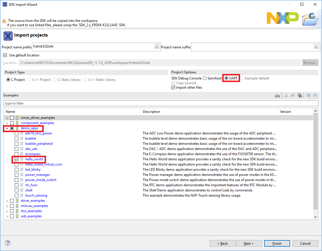 The following steps will guide you through opening the hello_world application. These steps may change slightly for other example applications as some of these applications may have additional layers of folders in their path.