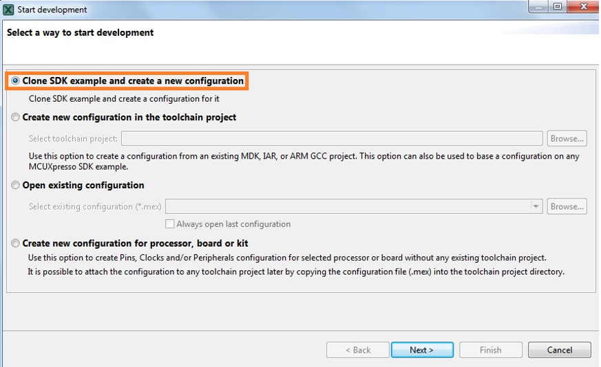 オプションB:MCUXpresso Config Toolsを使用して、サード・パーティ製IDEで使用するために既存のMCUXpresso SDKのサンプルのクローンを作成します。