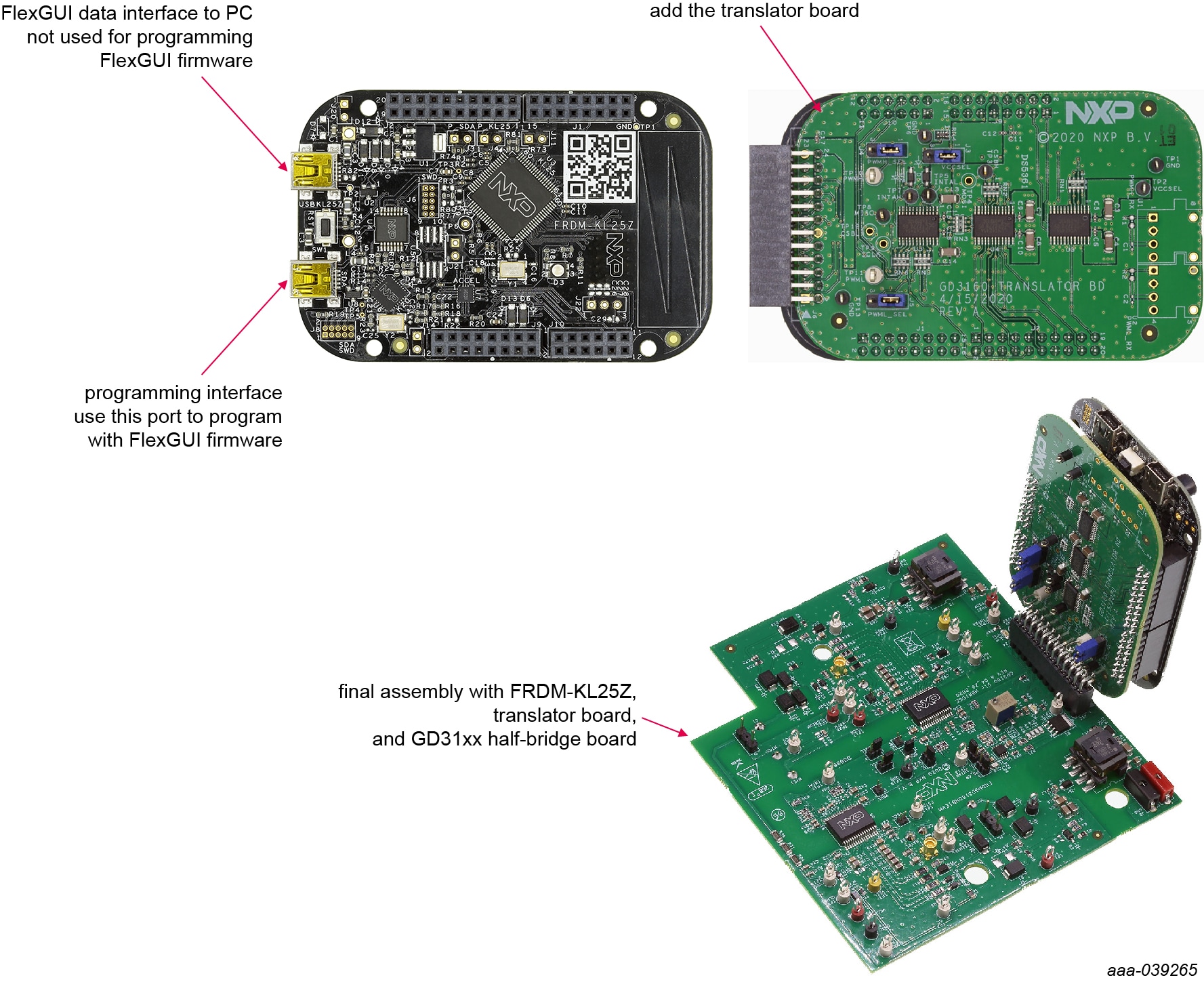 Software for FRDMGD3160HBIEVM is distributed with the FlexGUI tool (available on NXP.com). Necessary firmware comes pre-installed on the FRDM-KL25Z with the kit.