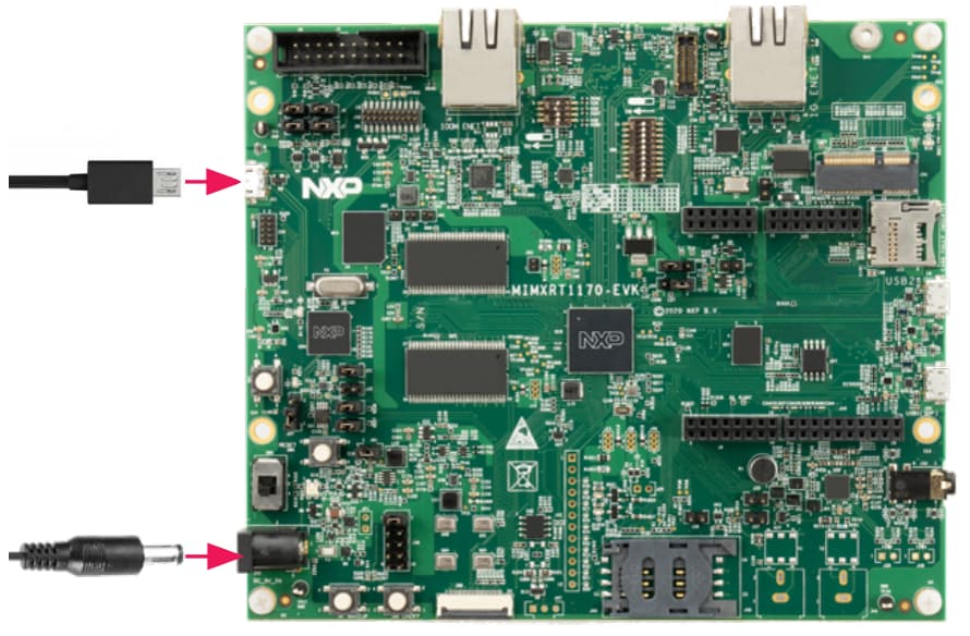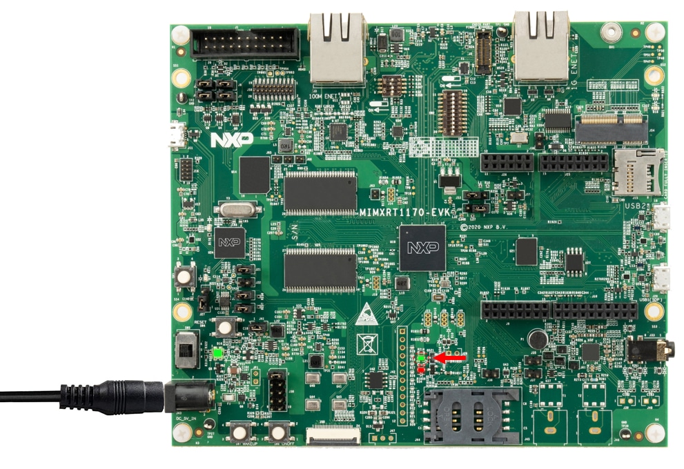 MIMXRT1170-EVKボードには、接続されるとボード上のLEDが点滅するデモが事前にプログラム済みです。