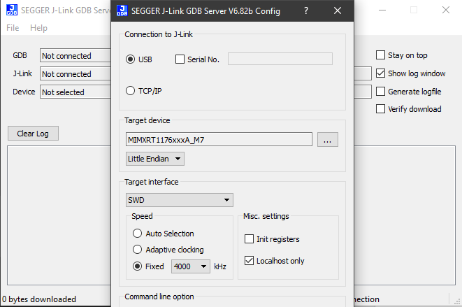 3. 表示されたウィンドウで設定を行い、[Serial(シリアル)]ラジオ・ボタンを選択して、事前に確認したCOMポート番号を入力します。ボーレートもあわせて指定します。今回は「115200」を入力します。