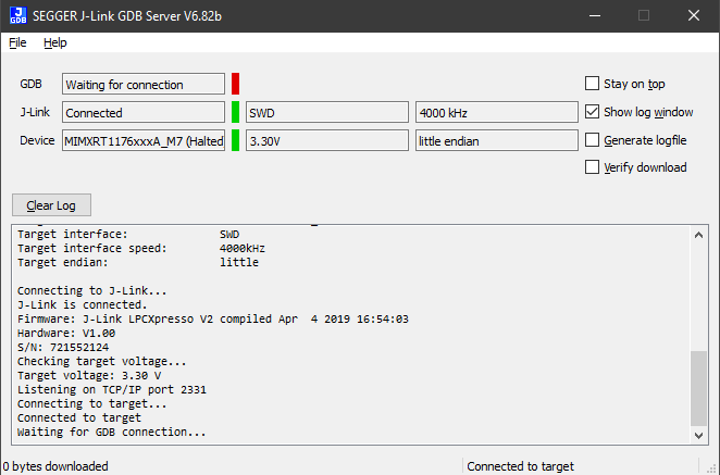 9. 接続が確立されているか検証します。接続されている場合、MCUXpresso IDEの[Terminal(端末)]ビューの表示は下図のようになります。