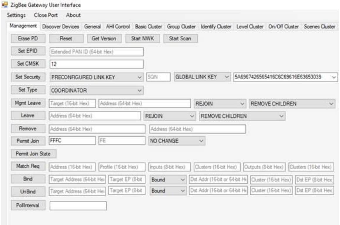 The ZGWUI.exe file is used to setup the ZigBee network. It is available from the JN-AN-1247-ZigBee-3-0-ControlBridge package (folder AN1247\Tools\TestGUI\Source\bin\Debug).