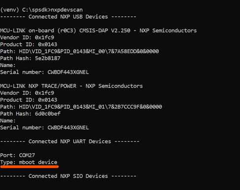 >> venv\Scripts\activateJ14に接続してUARTペリフェラルを使用します。EVKでは、次の方法でISPに入ることができます >> nxpdevscan