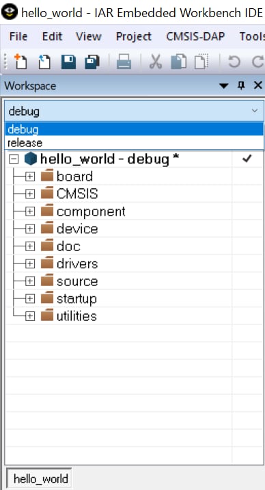 次の手順に従ってhello_worldアプリケーションを開きます。このアプリケーションのコードは、Cortex M33コアとDSPコアの両方に対応します。以下の説明では、Cortex M33コアのコンパイルとデバッグの手順を取り上げています。