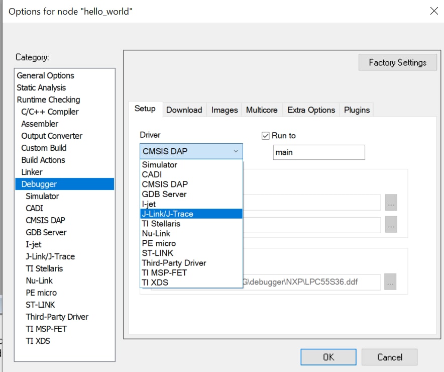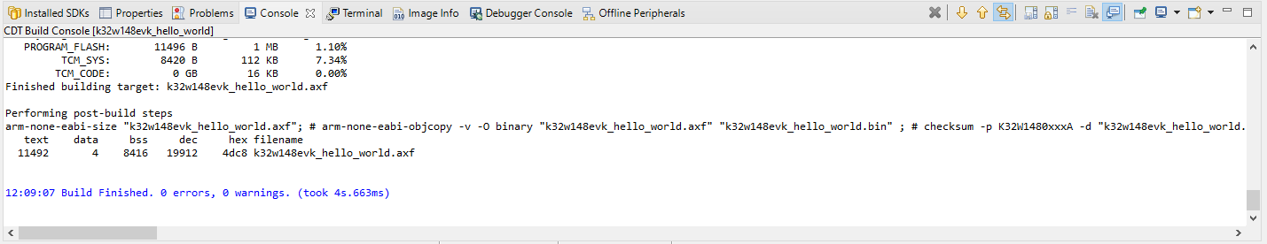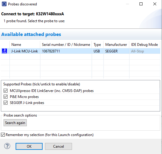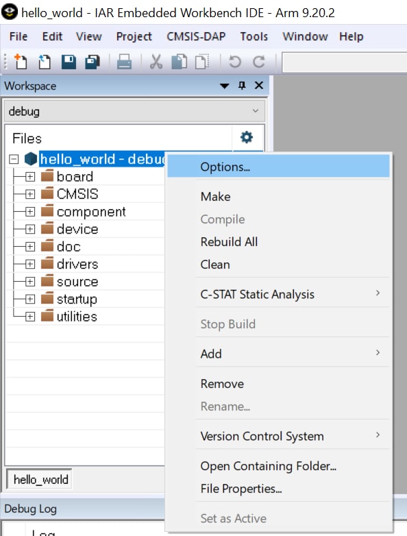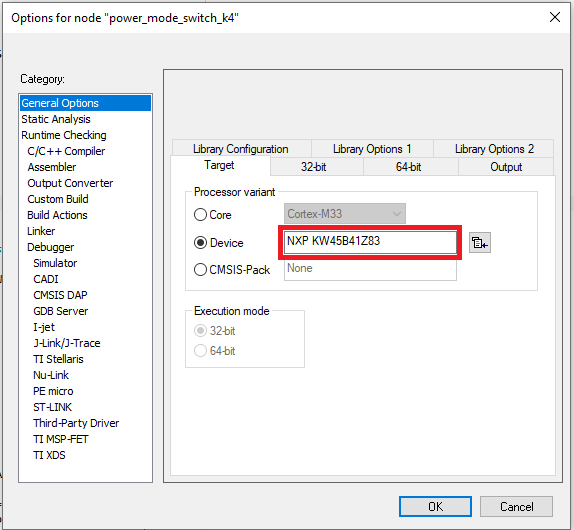 注:ビルド・エラーが発生した場合は、正しいボードが選択されていることを確認します。プロジェクトを右クリックし、[Options(オプション)]>>[General Options(一般オプション)]>>[Target(ターゲット)]>>[Device(デバイス)]の順に進み、「NXP KW45B41Z83」を選択します。このボードはIAR Embedded Workbench for Armバージョン8.50.9以上でサポートされています。