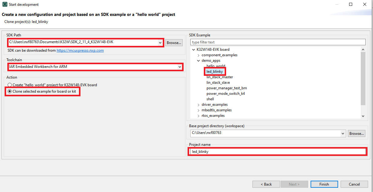 次に、クローンを作成するプロジェクトを選択します。この例では、GPIO LED出力プロジェクトを使用します。フィルタのボックスに「led」と入力してプロジェクトを絞り込み、「led_blinky」プロジェクトを選択します。また、プロジェクトのクローンの作成先と名前を指定することもできます。[Finish(完了)]をクリックします。