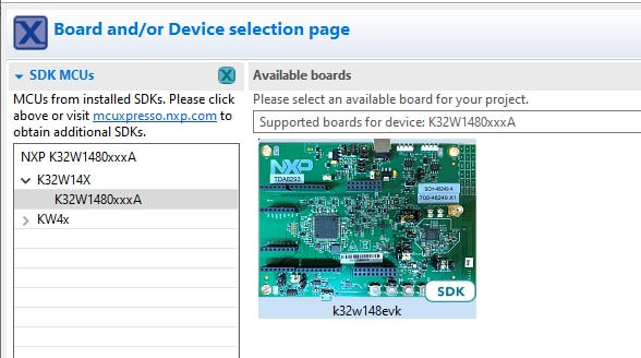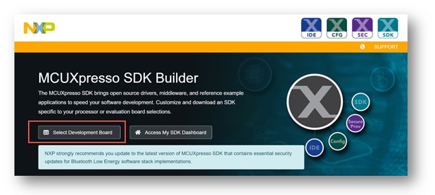 MCUXpresso SDKは、MCUXpresso SDKのウェブサイト (mcuxpresso.nxp.com) から直接インストールできます。[Select Development Board(開発ボードの選択)]をクリックして、評価ボードを検索します。