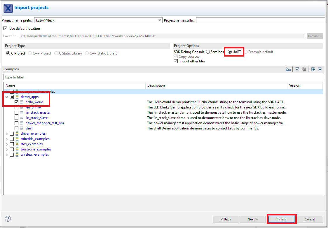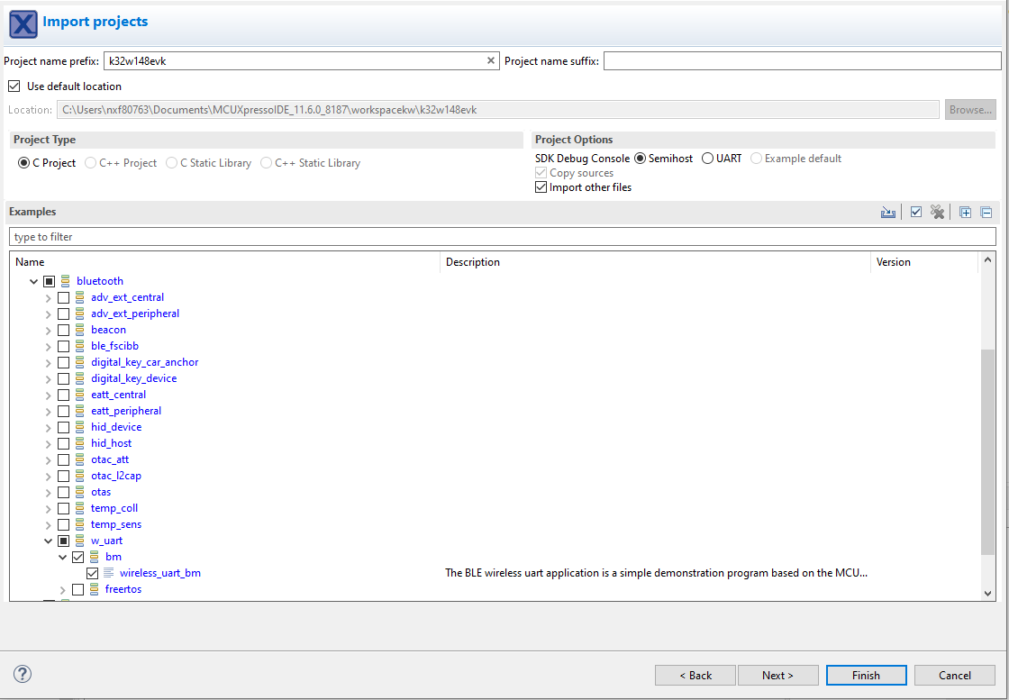 wireless_examples]カテゴリを展開し、次に[bluetooh]サンプルを展開したら、w_uartの横にあるチェックボックスをクリックしてサンプルを選択します。出力用にデフォルトのセミホスティングではなくUARTを使用するには、[Project Options(プロジェクト・オプション)]にある[SDK Debug Console(SDKデバッグ・コンソール)]のチェック・ボックスで[UART]を選択します。[Finish(完了)]をクリックします。