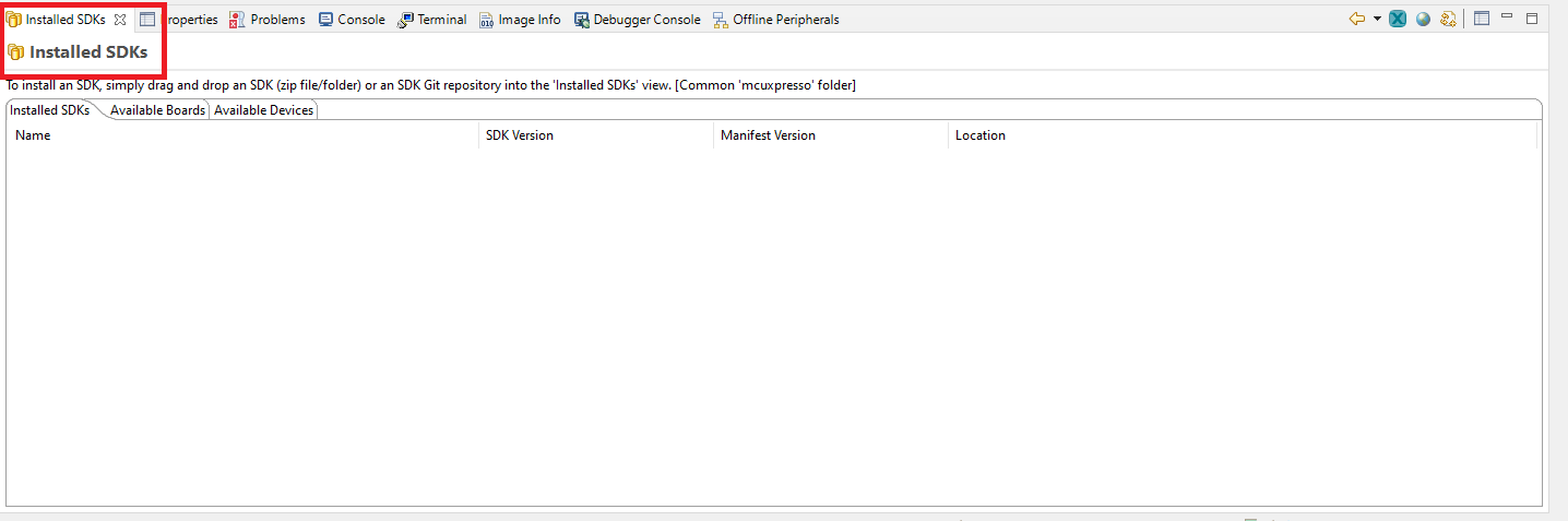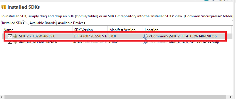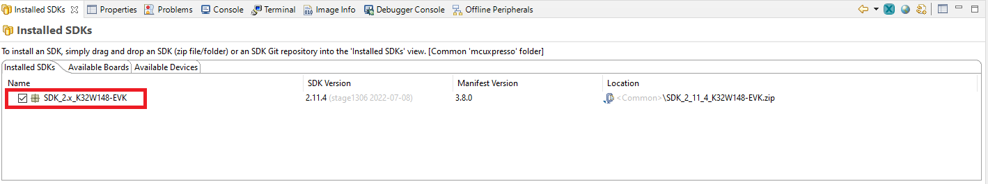 SDKパッケージがダウンロードされたら、MCUXpresso IDEの[Installed SDKs(インストール済みSDK)]ウィンドウにドラッグ&ドロップします。