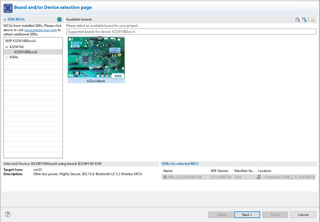 MCUXpresso SDKには、サンプル・アプリケーション・コードが豊富に用意されています。利用可能なコードを確認するには、SDKをインストールしたフォルダのSDKボード・フォルダを参照し、「K32W148」() を選択します。