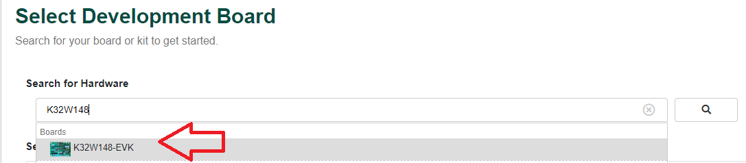 [Search for Hardware(ハードウェアの検索)]検索ボックスに、選択したボード「K32W148-EVK」を入力します。ボードをクリックして選択します。