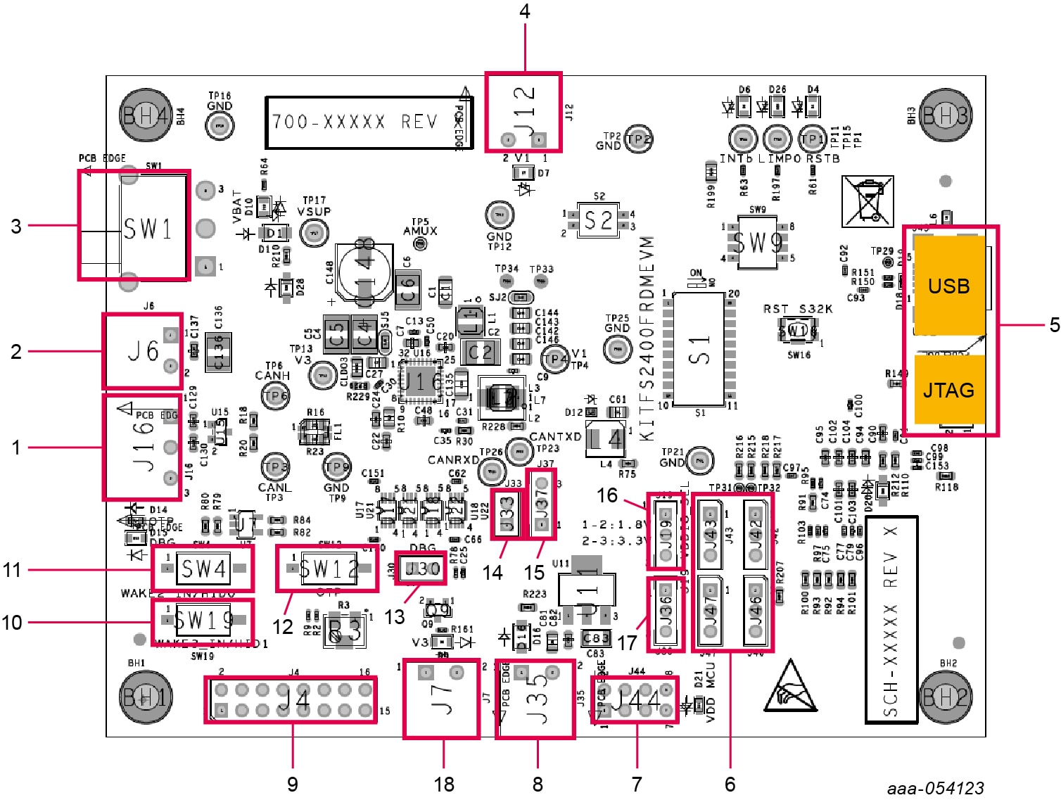 1. ボードのジャンパとスイッチがデフォルト位置に設定されていることを確認します。このデフォルトのデバッグ構成により、S32K144 MCU(SPI経由)およびGUIによるボードの完全な制御が可能になります。キットに搭載されているコンポーネントには、デフォルトのジャンパ構成とスイッチ構成があります。
